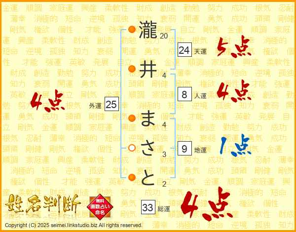 瀧(20画)井(4画) ま(4画)さ(3画)と(2画)