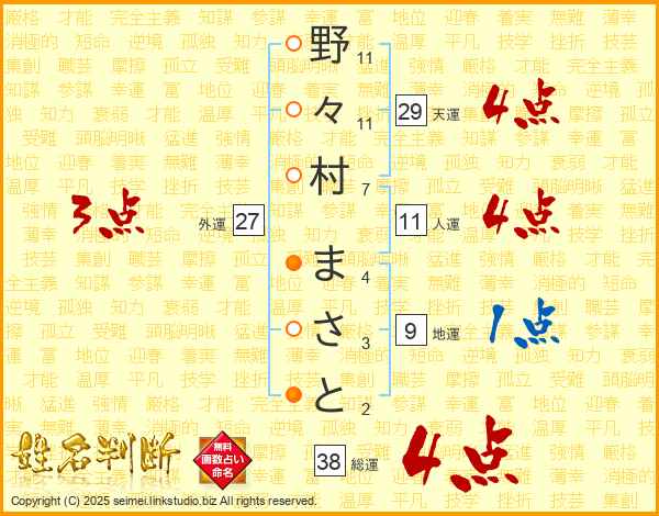 生活面を象徴する運勢です。外部から受ける影響力を表し、結婚運、家庭運や職場、環境への順応性を表します。総運から人運を引いた画数。姓や名が1文字の場合を除く。