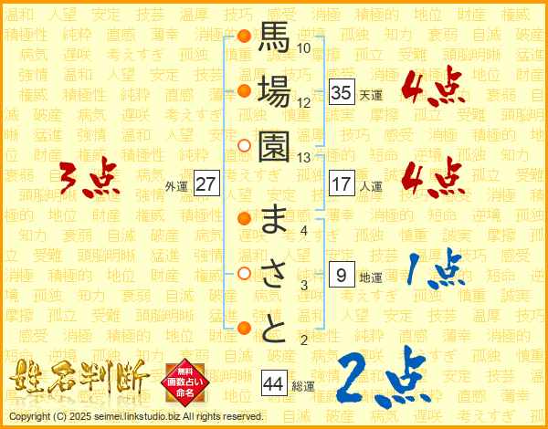 生活面を象徴する運勢です。外部から受ける影響力を表し、結婚運、家庭運や職場、環境への順応性を表します。総運から人運を引いた画数。姓や名が1文字の場合を除く。