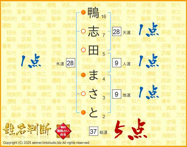 鴨(16画)志(7画)田(5画) ま(4画)さ(3画)と(2画)