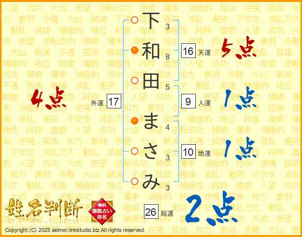 生活面を象徴する運勢です。外部から受ける影響力を表し、結婚運、家庭運や職場、環境への順応性を表します。総運から人運を引いた画数。姓や名が1文字の場合を除く。