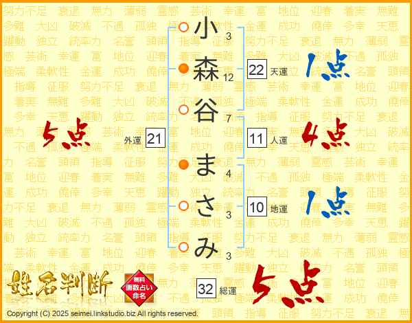 生活面を象徴する運勢です。外部から受ける影響力を表し、結婚運、家庭運や職場、環境への順応性を表します。総運から人運を引いた画数。姓や名が1文字の場合を除く。