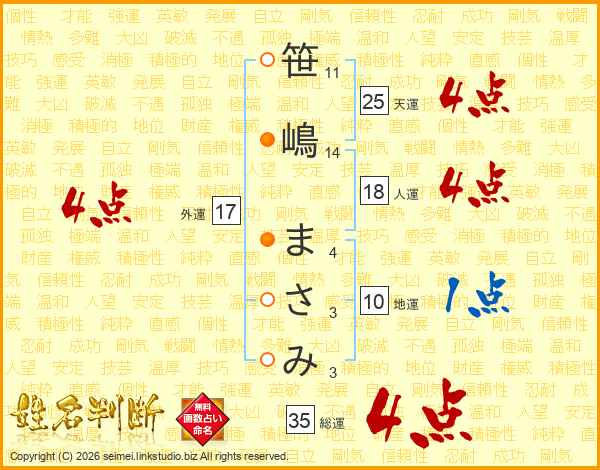 笹(11画)嶋(14画) ま(4画)さ(3画)み(3画)