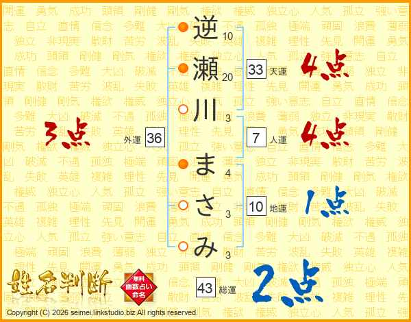 逆瀬川まさみさんの総運は43画の2点!