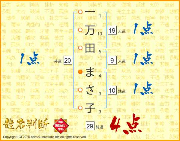 一(1画)万(13画)田(5画) ま(4画)さ(3画)子(3画)