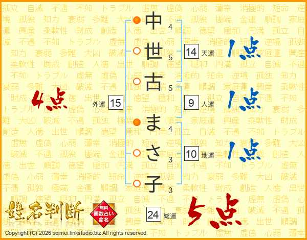 中(4画)世(5画)古(5画) ま(4画)さ(3画)子(3画)