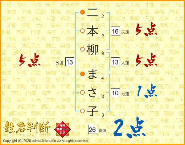 二(2画)本(5画)柳(9画) ま(4画)さ(3画)子(3画)