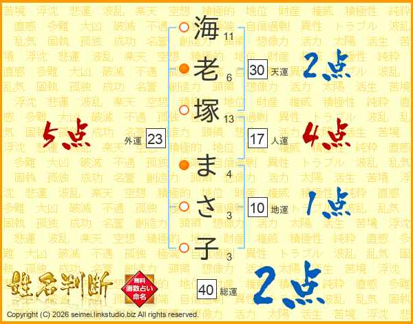 海(11画)老(6画)塚(13画) ま(4画)さ(3画)子(3画)