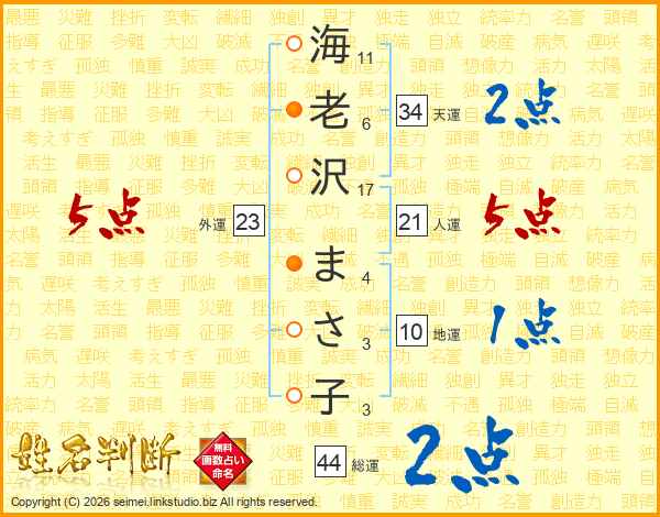 海(11画)老(6画)沢(17画) ま(4画)さ(3画)子(3画)
