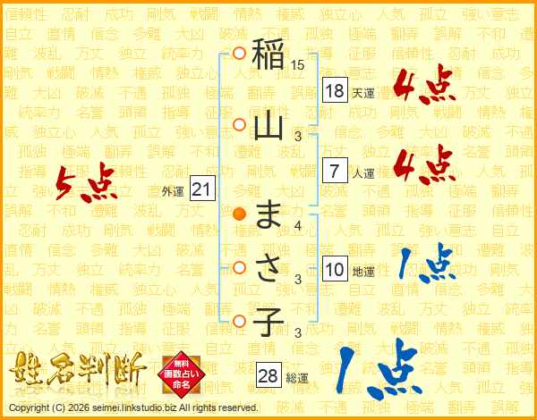 稲(15画)山(3画) ま(4画)さ(3画)子(3画)