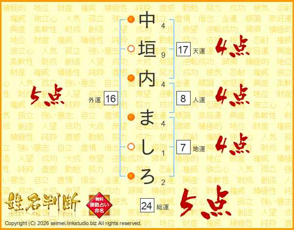 中(4画)垣(9画)内(4画) ま(4画)し(1画)ろ(2画)