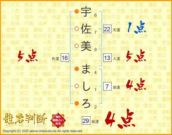 宇(6画)佐(7画)美(9画) ま(4画)し(1画)ろ(2画)