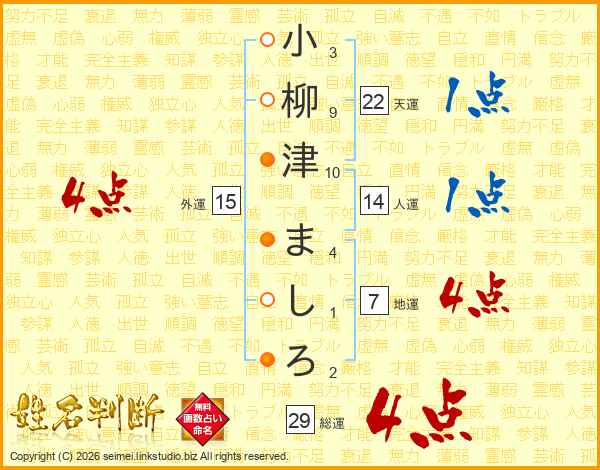 小(3画)柳(9画)津(10画) ま(4画)し(1画)ろ(2画)