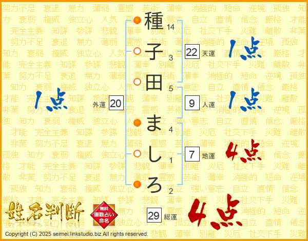 種(14画)子(3画)田(5画) ま(4画)し(1画)ろ(2画)