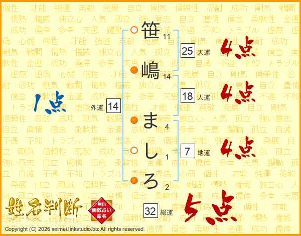 笹(11画)嶋(14画) ま(4画)し(1画)ろ(2画)
