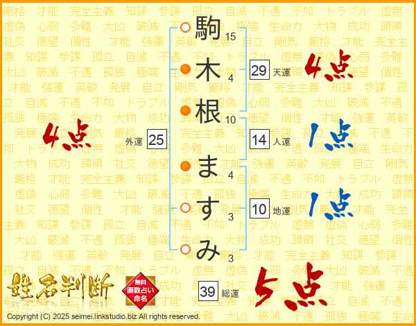 駒(15画)木(4画)根(10画) ま(4画)す(3画)み(3画)