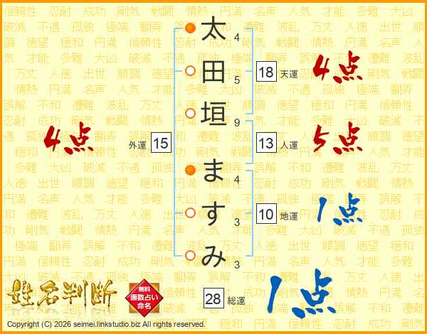 太(4画)田(5画)垣(9画) ま(4画)す(3画)み(3画)