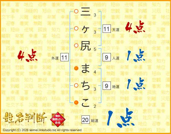 三(3画)ヶ(3画)尻(5画) ま(4画)ち(3画)こ(2画)