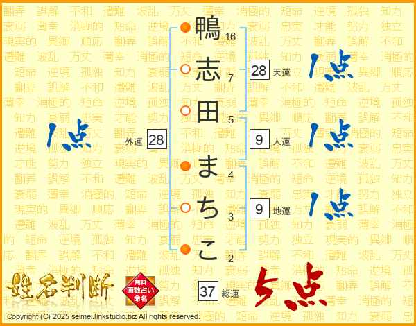 鴨(16画)志(7画)田(5画) ま(4画)ち(3画)こ(2画)