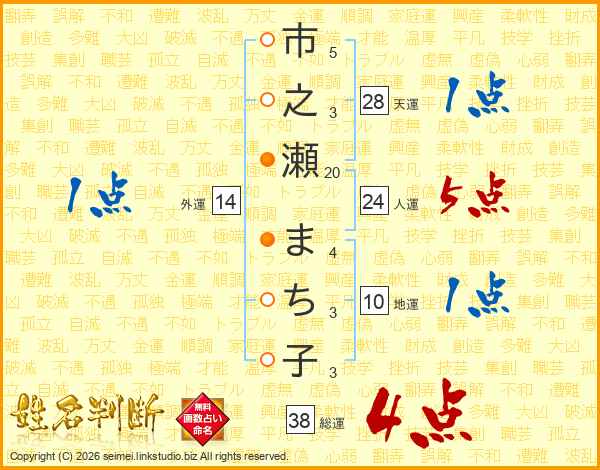 市(5画)之(3画)瀬(20画) ま(4画)ち(3画)子(3画)