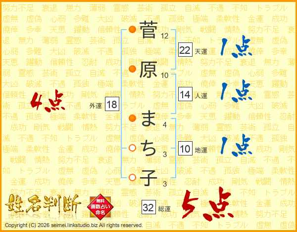 菅(12画)原(10画) ま(4画)ち(3画)子(3画)