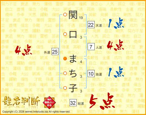 関(19画)口(3画) ま(4画)ち(3画)子(3画)