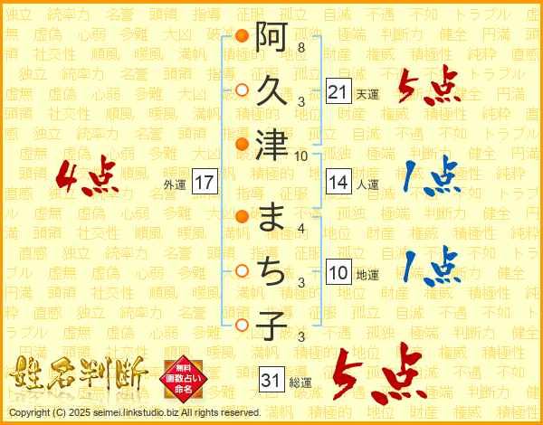 阿(8画)久(3画)津(10画) ま(4画)ち(3画)子(3画)