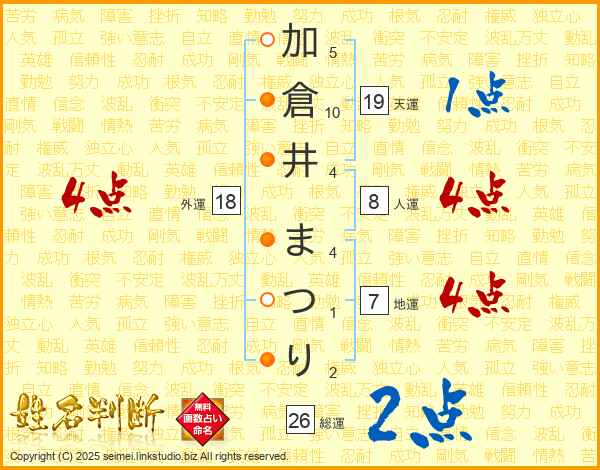 生活面を象徴する運勢です。外部から受ける影響力を表し、結婚運、家庭運や職場、環境への順応性を表します。総運から人運を引いた画数。姓や名が1文字の場合を除く。