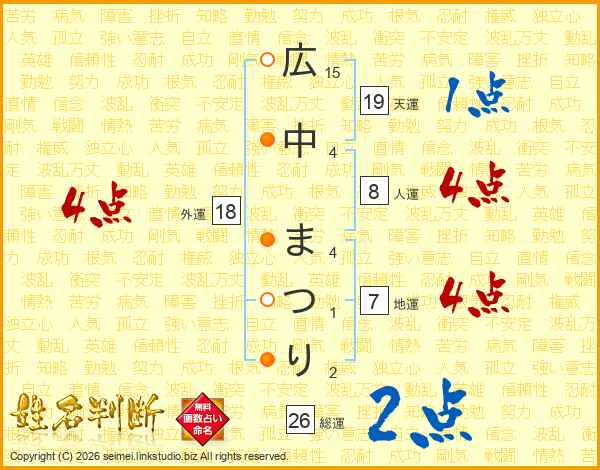生活面を象徴する運勢です。外部から受ける影響力を表し、結婚運、家庭運や職場、環境への順応性を表します。総運から人運を引いた画数。姓や名が1文字の場合を除く。