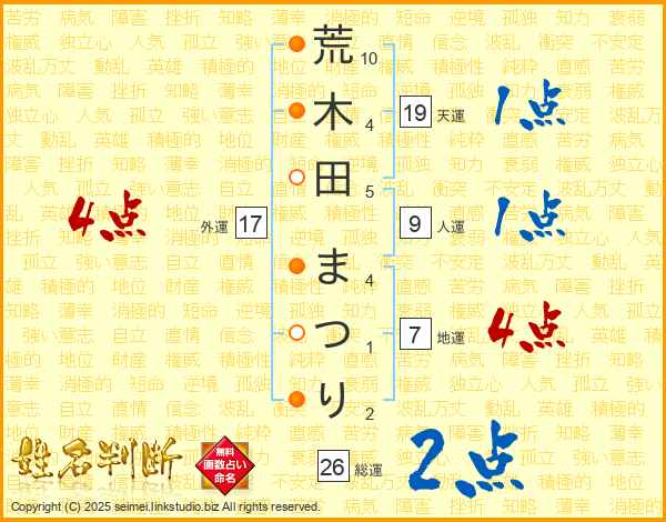 荒(10画)木(4画)田(5画) ま(4画)つ(1画)り(2画)