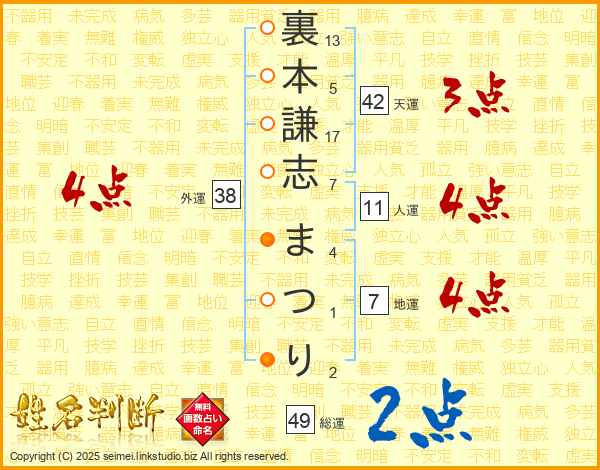 裏(13画)本(5画)謙(17画)志(7画) ま(4画)つ(1画)り(2画)