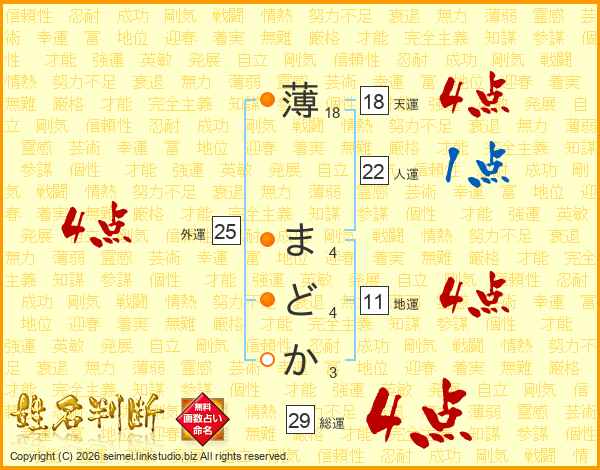 生活面を象徴する運勢です。外部から受ける影響力を表し、結婚運、家庭運や職場、環境への順応性を表します。総運から人運を引いた画数。姓や名が1文字の場合を除く。