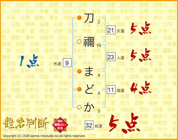 刀(2画)禰(19画) ま(4画)ど(4画)か(3画)