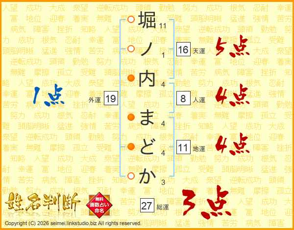 堀(11画)ノ(1画)内(4画) ま(4画)ど(4画)か(3画)