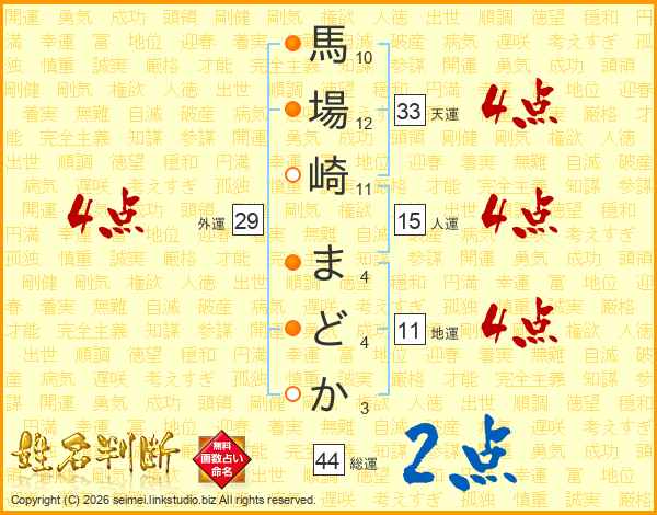 生活面を象徴する運勢です。外部から受ける影響力を表し、結婚運、家庭運や職場、環境への順応性を表します。総運から人運を引いた画数。姓や名が1文字の場合を除く。