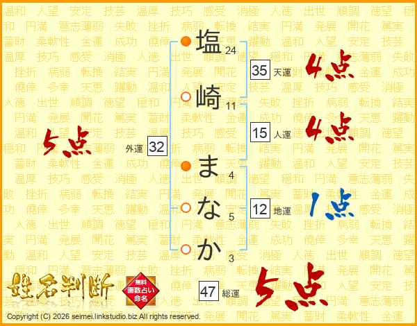 塩(24画)崎(11画) ま(4画)な(5画)か(3画)