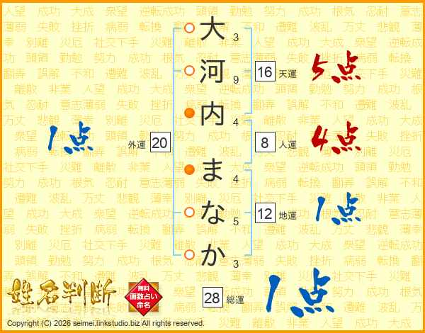 大(3画)河(9画)内(4画) ま(4画)な(5画)か(3画)