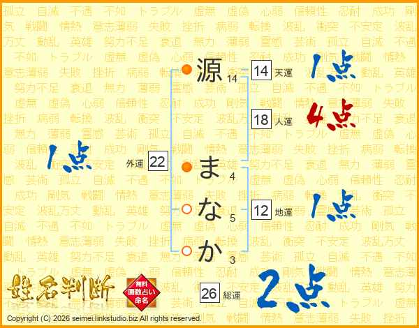 生活面を象徴する運勢です。外部から受ける影響力を表し、結婚運、家庭運や職場、環境への順応性を表します。総運から人運を引いた画数。姓や名が1文字の場合を除く。