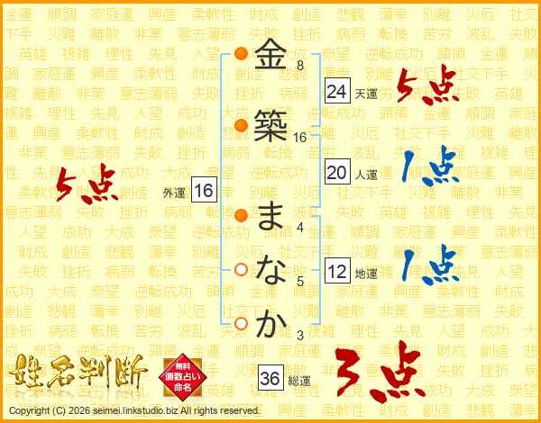 金(8画)築(16画) ま(4画)な(5画)か(3画)