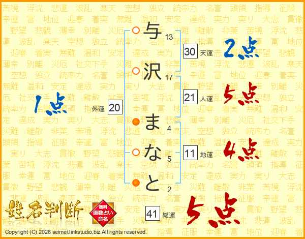 与沢まなとさんの総運は41画の5点!