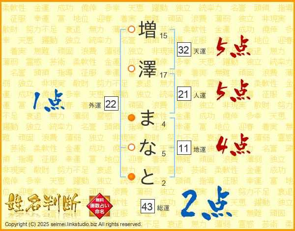 増(15画)澤(17画) ま(4画)な(5画)と(2画)