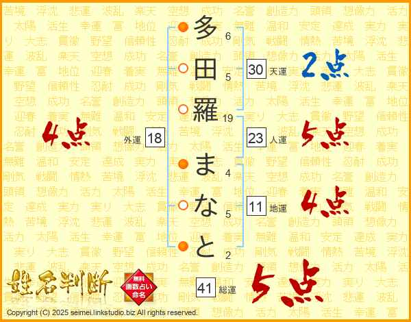 あなたの人生を表す1番重要な運勢です。生涯を通じて影響する総合運となり、主に50歳以降の晩年期に影響を及ぼします。苗字と名前の合計画数。