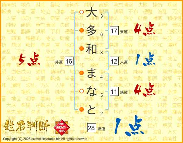 大多和まなとさんの総運は28画の1点!