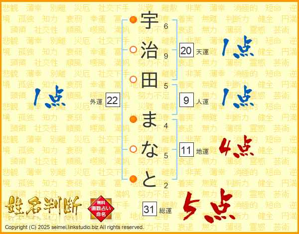 宇(6画)治(9画)田(5画) ま(4画)な(5画)と(2画)