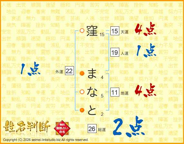 窪まなとさんの総運は26画の2点!