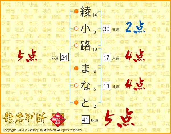 綾(14画)小(3画)路(13画) ま(4画)な(5画)と(2画)