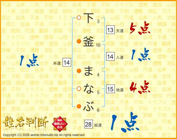 下釜まなぶさんの総運は28画の1点!
