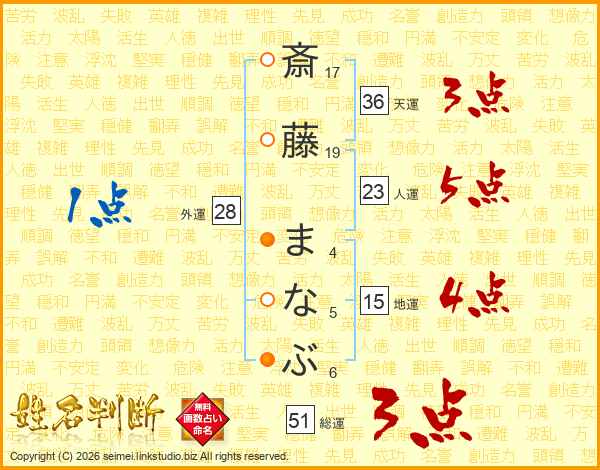 斎藤まなぶさんの総運は51画の3点!