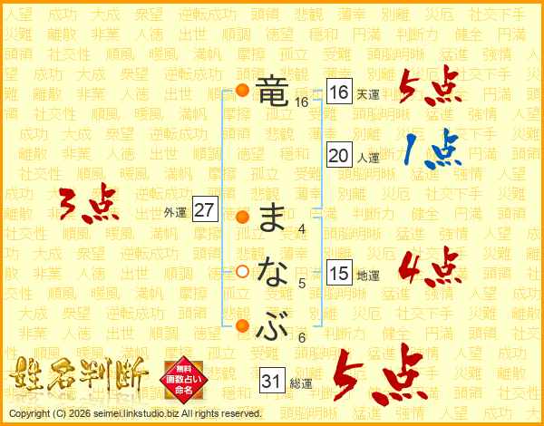 竜(16画) ま(4画)な(5画)ぶ(6画)