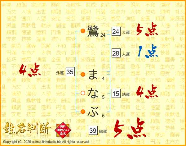 鷺(24画) ま(4画)な(5画)ぶ(6画)